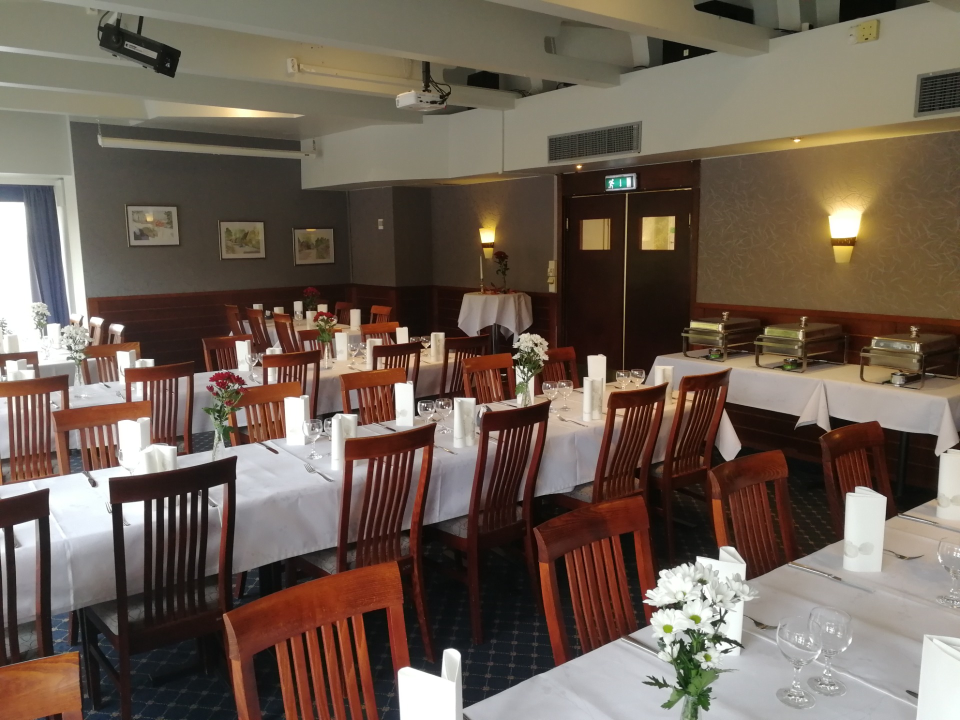 Jokaisessa salissa on kustavilaistyyliset vaaleat kalusteet, pöydissä pitsiliinat sekä kattauksessa käytämme aina kankaisia lautasliinoja. Pöydissä on kynttilät sekä tuoreet kukat. Piano kuuluu jokaisen salin varustukseen ja CD-soitin on etukäteen varattavissa. Jokaisessa salissa on käytettävissä virsi- ja koraalikirjat.