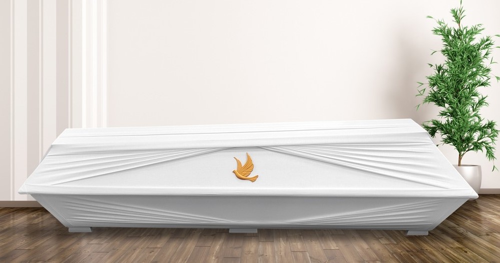 Puuvillalla verhoiltu arkku kultaisella kyyhkykoristeella
